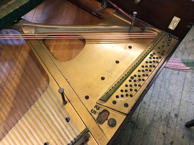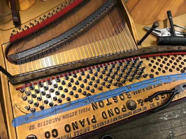 Step one: put piano on its back and start taking off old strings and tuning pins