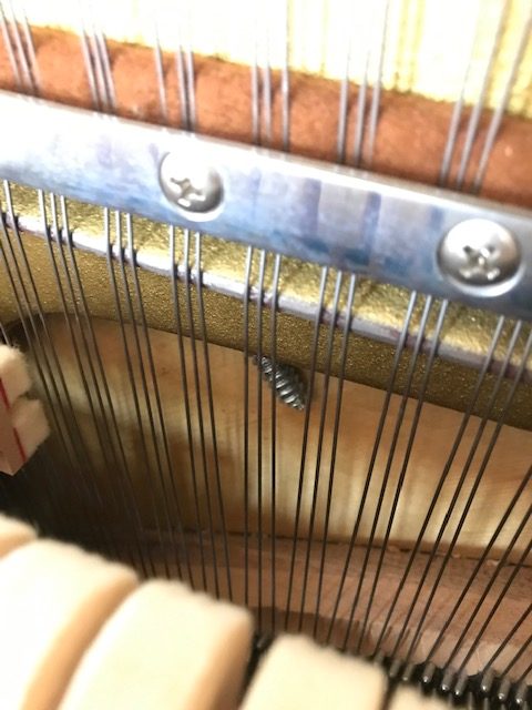 I noticed this screw dangling down behind the strings. I believe it is a perimeter plate bolt. I can not speak very highly of the quality of non-Japonise Asian made pianos. Maybe it was made on a Friday afternoon.