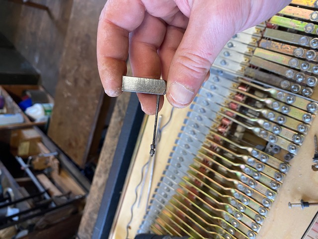 Customer brought in a Rhodes he owned since new. Had a pipe burst and there was water damage. That led to a lot of rust on this old girl. Here is just one of the 73 tines before cleaning off rustAnd here it is after. Repeat 73 times. The end result was very nice. She is back in action and ready for years more enjoyment